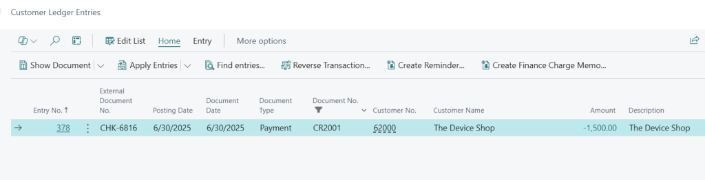 External Document No.    Enter the customer’s check number or other payment reference Appears in customer ledger entries and posted documents Helps with traceability and payment matching If not visible, click “Show more columns” or personalize the journal page