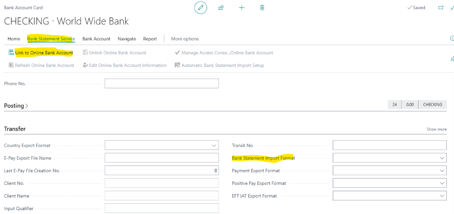 - Open Bank Account Card (search “Bank Account” in the Tell Me box).