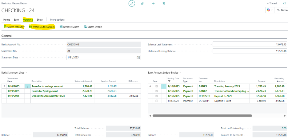 When criteria match, Business Central links bank statement lines to ledger entries automatically.