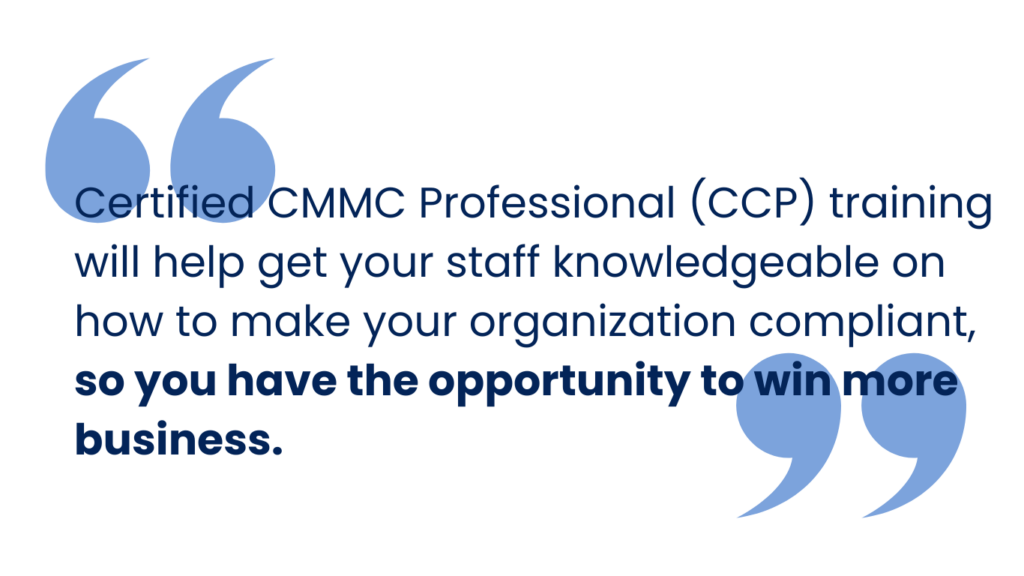 Once CMMC is a contract requirement, these are the people that will help you get ready for certification which will provide you the opportunity to win more business. Let’s repeat that again. Certified CMMC Professional (CCP) training will help get your staff knowledgeable on how to make your organization compliant, so you have the opportunity to win more business.