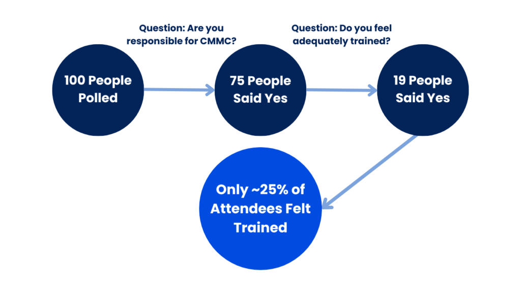 During a recent conference I asked attendees how many were handed the responsibility of getting their company ready for CMMC just because they had the responsibility of IT in their role or title. More than three quarters of the attendees in the room had their hands up. I followed this by asking how many thought they had the appropriate level of expertise or training to get their company compliant and ready for CMMC and less than a quarter of attendees had their hand up including those that had the responsibility of IT.
