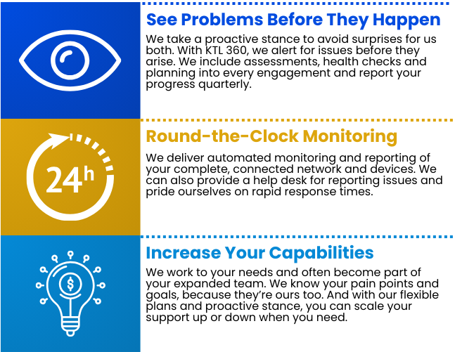 With KTL 360, we relieve your burden of managing technology with a next generation managed service offering that dramatically streamlines your IT operations and augments your capabilities when you need them. Our team can virtually eliminate the day-to-day demands through proactive monitoring and management. KTL 360 offers the service and insights you need today and that evolve with you as you grow.