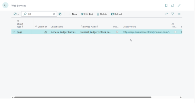 Go to Web Services in Business Central and publish Page 20 (G/L Entry).
