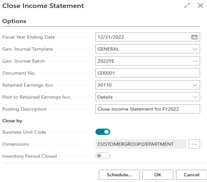You can either schedule the Close Income Statement process for a specific time or click OK to process it immediately.