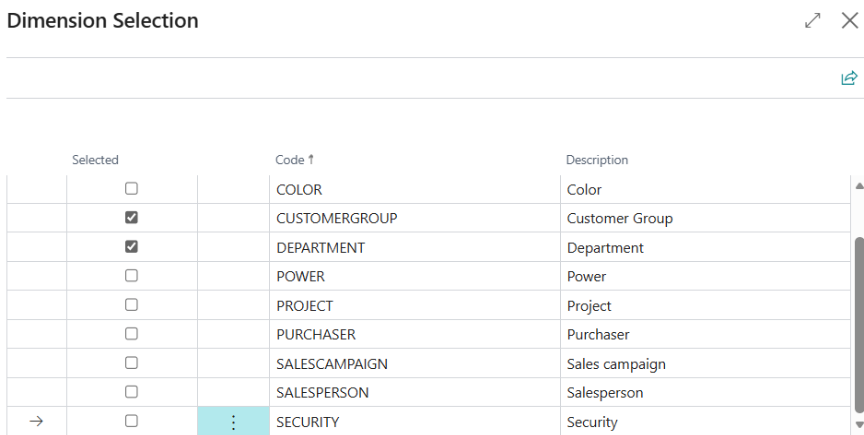 - Dimensions: Closing by dimension allows for more detailed tracking and reporting capabilities. To select your dimensions, click on the three dots in the box, and a display will appear, enabling Dimension Selection. This should be used to close the accounts if a beginning balance is showing for a Revenue or Expense Account on the trial balance by dimensions report after the initial closing process, and should include the Dimension Codes used for the General Ledger Entries.