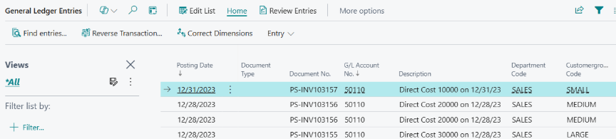 Generate the Test Report with Show Dimensions and download the report to review. Then, generate the Preview Posting and select Open in Excel to review the journal entry transactions with the dimensions.