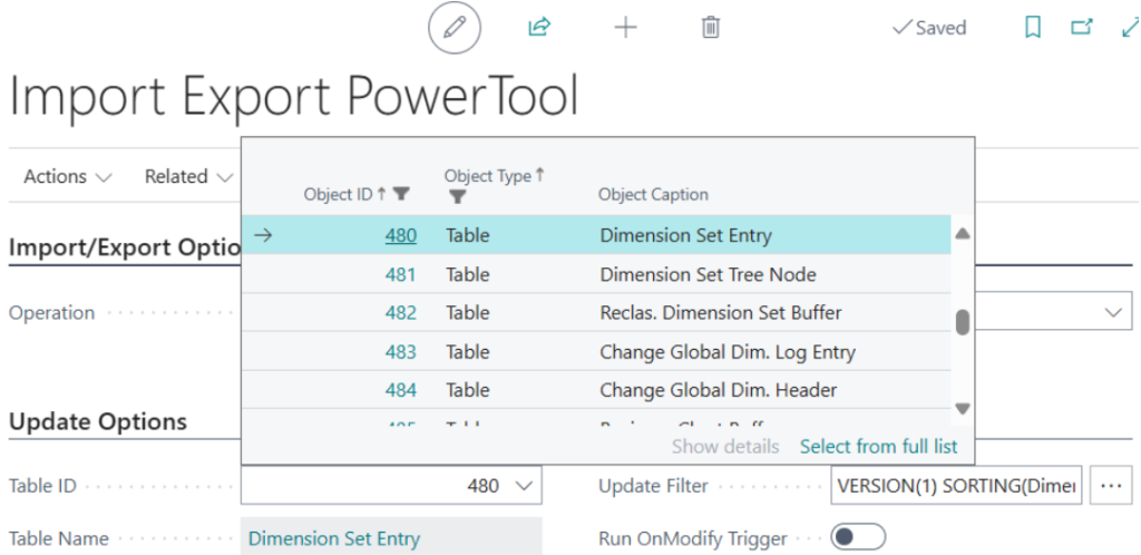 Use the Update Filter to search for the Dimension Value Code to be replaced by clicking on the ellipse (three dots):