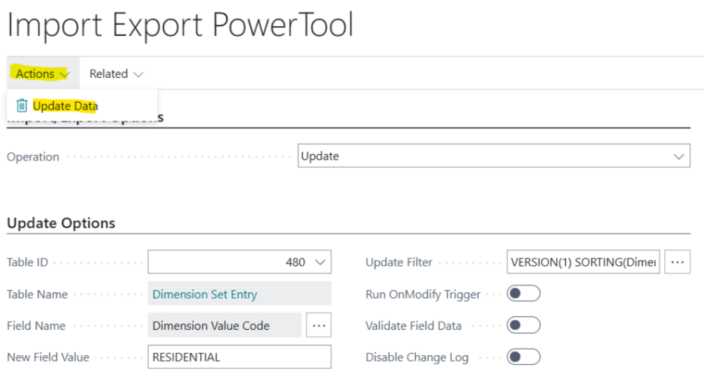 The filter will restrict the update to the specific Dimension Code and Dimension Value Code for the update.