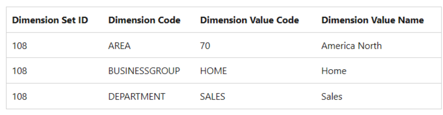 The following example shows a dimension set that has three dimension set entries. The dimension set is identified by a dimension set ID, which is 108.